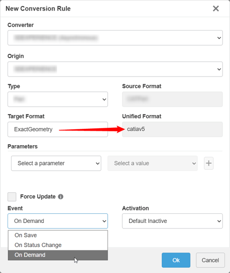 In deze regel zie je dat het Target Format een ExactGeometry maakt, waarbij het Unified Format de catiav5 extensie heeft.