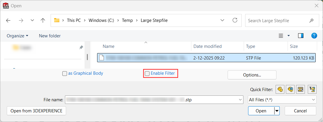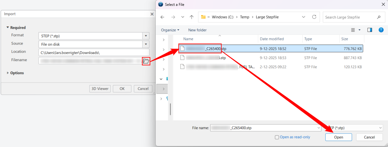 - Open het windows explorer venster om te zoeken naar de STEP-file: