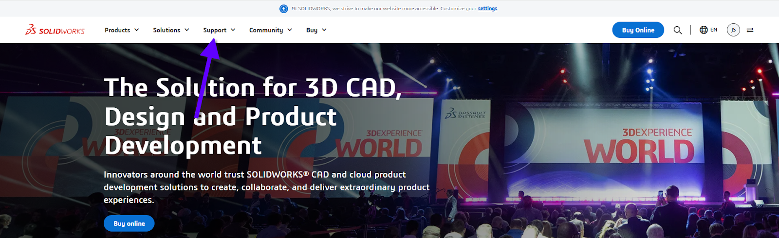Klik op het kopje ‘Support’ om naar de supportpagina van SOLIDWORKS te gaan.