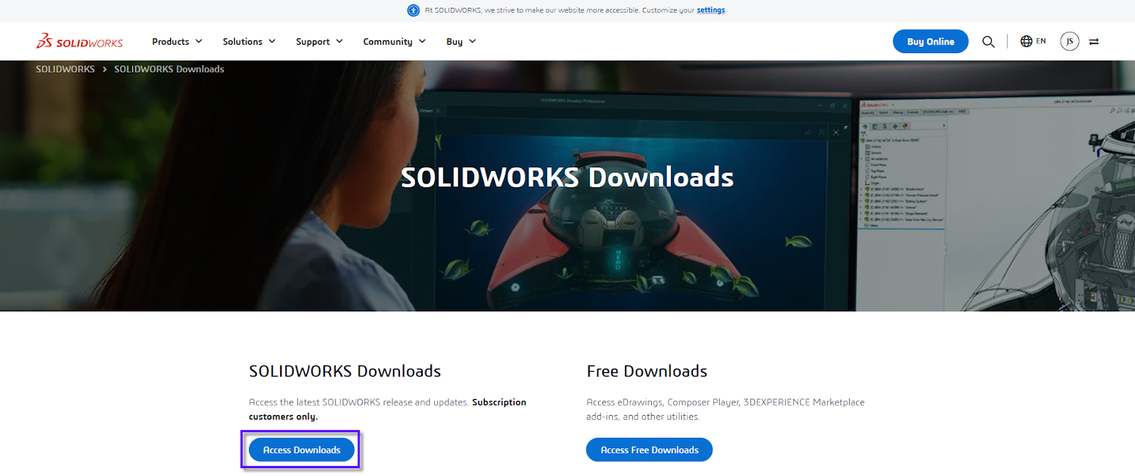 Klik vervolgens op ‘Access Downloads’ om het download archief van SOLIDWORKS te bereiken.
