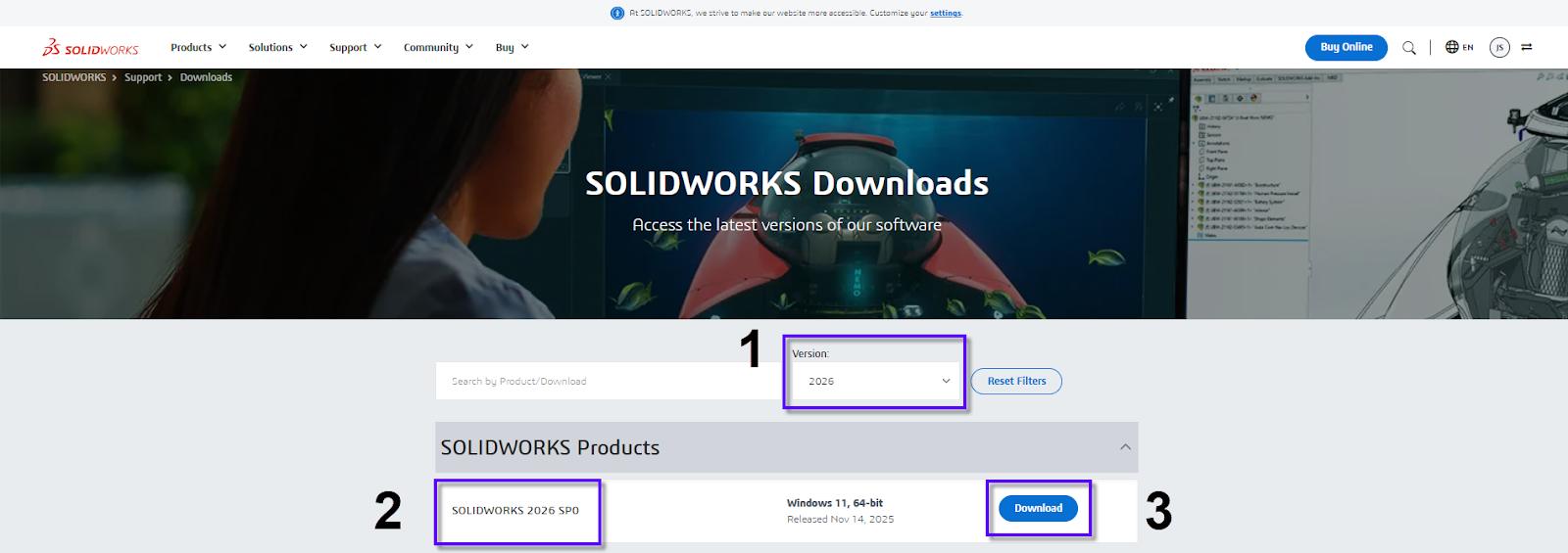 Selecteer versie 2026 (1), de gewenste Service Pack/SP (2) en start je SOLIDWORKS 2026 download (3). Kies bij voorkeur altijd de laatst beschikbare SP van een SOLIDWORKS release.