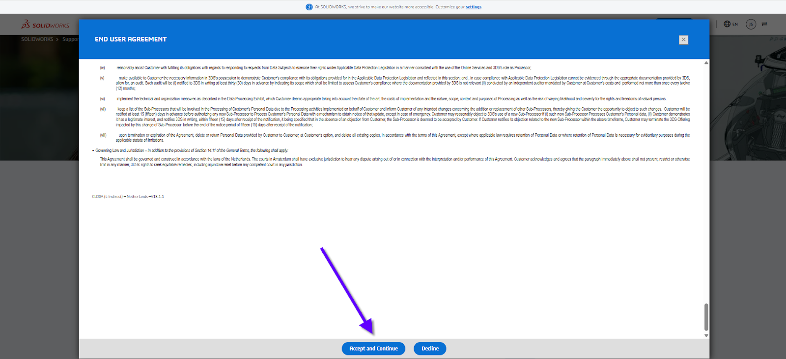 Klik op Accept and Continue wanneer je akkoord gaat met de End User Agreement. Hierna wordt de SolidWorksSetup.exe gedownload.